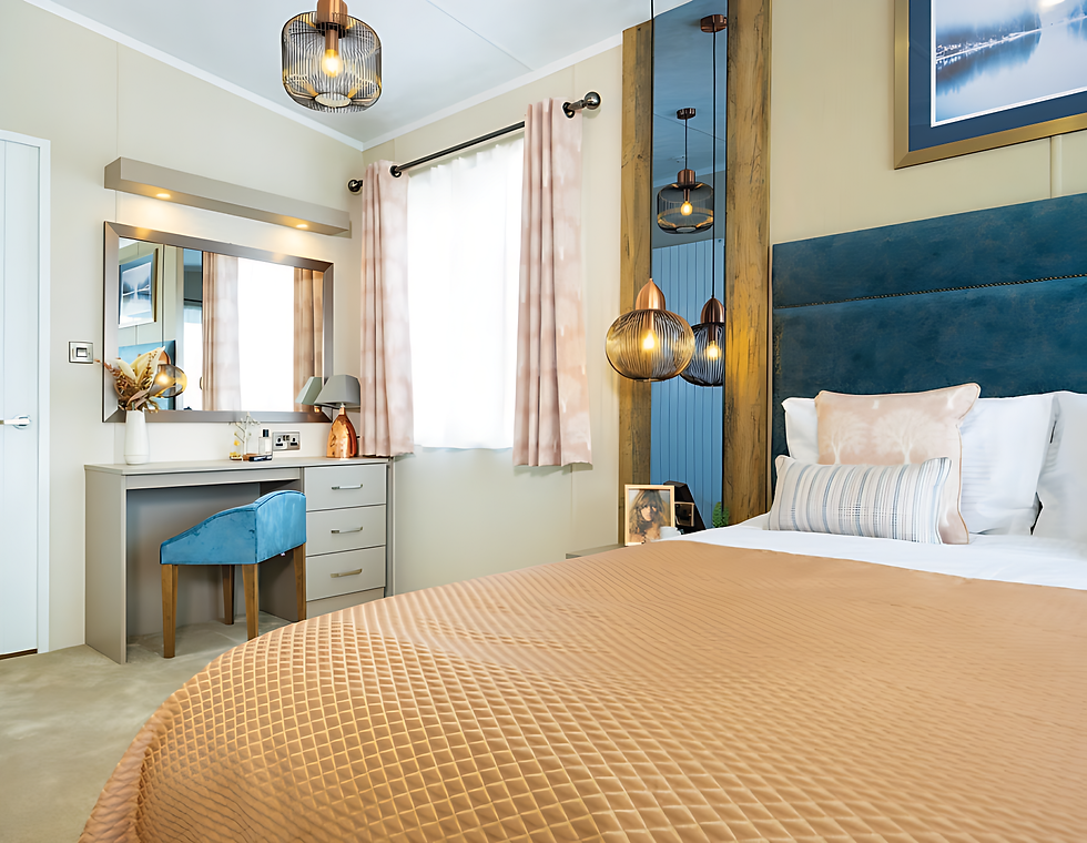 Industrial elements can be found in the lighting and the concrete effect dining and coffee table with a contrast metal base. Kitchen plinth lighting and under cupboard spotlights allow for ambient lighting in the evenings. Both bedrooms are bright and airy with a zesty, fresh colour scheme throughout. Available with 2 or 3 bedrooms where an air of freshness is created through a combination of feature walls alongside bright, zesty colours. The 2 bedroom version features a cleverly concealed, dressing area with hanging space, shelving and drawers.